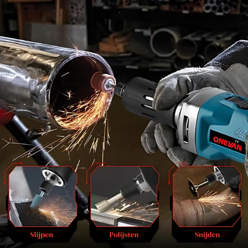 - Ergonomisch Ontwerp: ONEVAN geeft prioriteit aan gebruikerscomfort met een ergonomisch ontwerp, voor een comfortabele grip en gebruiksgemak tijdens lange slijpsessies. Ervaar precisie en controle bij elke taak.